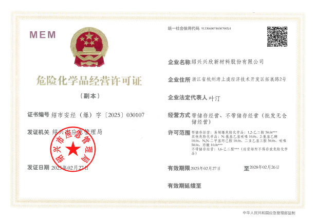 紹興興欣新材料股份有限公司成立于2002年06月27日,占地面積122畝,位于杭州灣上虞經(jīng)濟技術開發(fā)區(qū)拓展路2號,現(xiàn)有職工200余人,專業(yè)技術人員50余人;博士、碩士研究生30余人組成的一支知識型、專業(yè)化的技術科研團隊。公司面向全球市場,專業(yè)開發(fā)電子化學品、環(huán)保化學品、醫(yī)藥中間體、高分子材料等先進新材料重點領域的省級科技型企業(yè);建有浙江上虞、安徽東至兩個生產(chǎn)基地。目前為“國家高新技術企業(yè)”、浙江省“隱形冠軍”企業(yè)、浙江省專精特新中小企業(yè);建有“省級”研究開發(fā)中心,共建天津大學浙江紹興研究院電子化學品研發(fā)中心。